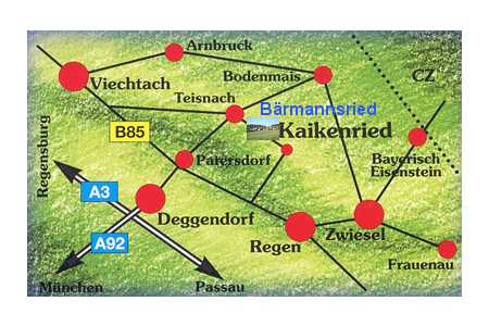 Von der Autobahn A3 oder A92 kommend nach Deggendorf und weiter auf der B11 - Fernverkehr - Richtung Bodenmais - Arber bis nach Teisnach. In Teisnach rechts abbiegen in Richtung Arnetsried - Kaikenried (REG18). Kurz vor dem Ort Kaikenried nach links nach Bärmannsried einbiegen. Sie haben Ihr Ziel fast erreicht. Anreise per Bahn: Ab Bahnhof Plattling weiter mit der Waldbahn nach Gotteszell in Richtung Viechtach. Haltepunkt ist der Bahnhof Teisnach. Anreise via Navigationssystem Bitte geben Sie als Ort Teisnach und dann die Dorfstraße 17 ein. Georg und Maria Kraus Dorfstraße 17 Bärmannsried 94244 Teisnach Telefon: 09923-9835 Ihre Buchungsanfrage direkt per Email: urlaub@ferienhof-kraus.com